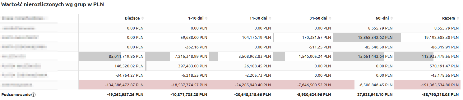 „Wartość nierozliczonych wg grup w PLN – tabela” – zestawienie prezentuje należności i zobowiązania w podziale na grupy rozrachunkowe. Dzięki temu można przeanalizować, które grupy generują największe obciążenia i jak kształtują się zaległości w czasie.