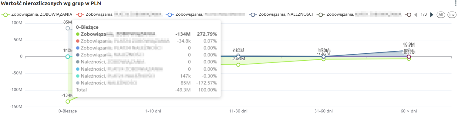 „Wartość nierozliczonych wg grup w PLN” – wykres prezentuje należności i zobowiązania w podziale na grupy rozrachunkowe oraz okresy przeterminowania. Dzięki temu można sprawdzić, jak rozkładają się wartości w różnych kategoriach i w jakich przedziałach czasu występują największe opóźnienia.