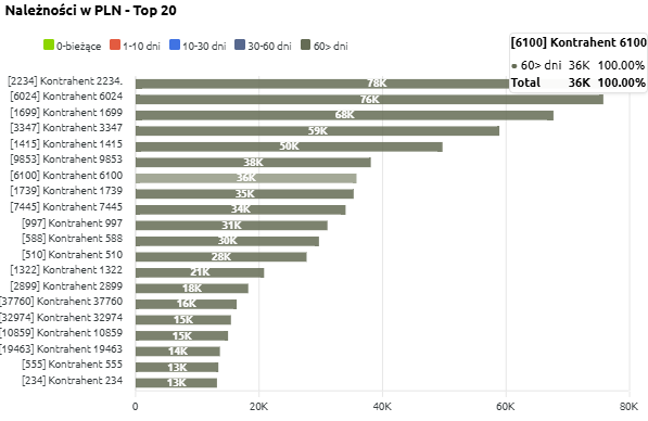 Dzięki temu wykres pozwala nie tylko wskazać kluczowych kontrahentów zalegających z płatnościami, ale także sprawdzić, jak długo poszczególne należności pozostają nierozliczone.