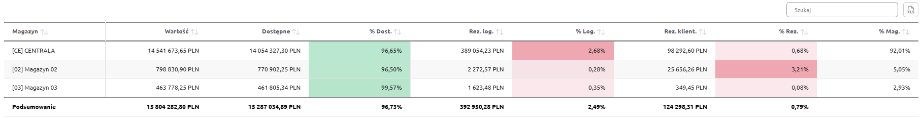 Dodatkowo można sortować dane, klikając w nagłówki kolumn – np. aby ułożyć magazyny według wartości całkowitej lub procentowego udziału rezerwacji.