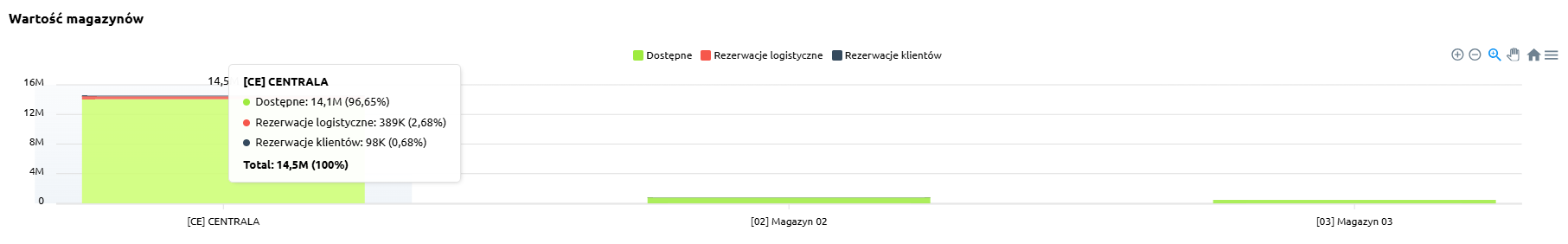 Dzięki temu użytkownik może szybko ocenić nie tylko wartości liczbowe, ale także proporcje między dostępnością a rezerwacjami w każdym magazynie.