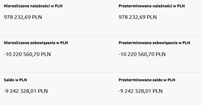 Przeterminowane saldo w PLN – różnica pomiędzy należnościami a zobowiązaniami, biorąc pod uwagę tylko wartości przeterminowane.