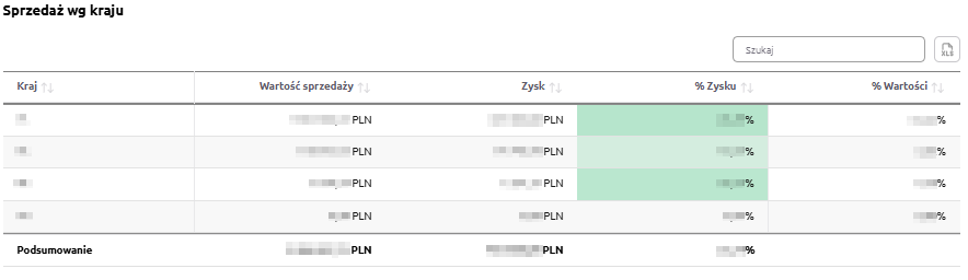 udział procentowy – wskazuje, jaką część całkowitej sprzedaży stanowi dany kraj.