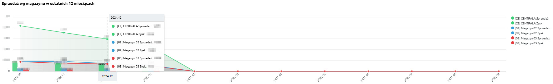 „Sprzedaż wg magazynu w ostatnich 12 miesiącach” – wykres prezentuje wartość sprzedaży oraz zysk w podziale na poszczególne magazyny i okresy miesięczne. Dzięki temu można obserwować, jak zmieniały się wyniki w czasie i które magazyny miały największy udział w sprzedaży.
