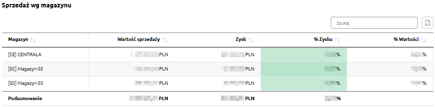 udział procentowy sprzedaży – wskazuje, jaką część całkowitej sprzedaży stanowi dany magazyn.
