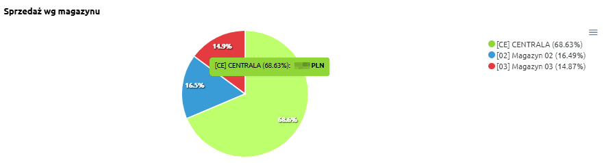 „Sprzedaż wg magazynu” – wykres prezentuje udział sprzedaży w podziale na poszczególne magazyny. Dzięki temu można sprawdzić, który magazyn generuje największy udział w całkowitej sprzedaży firmy.