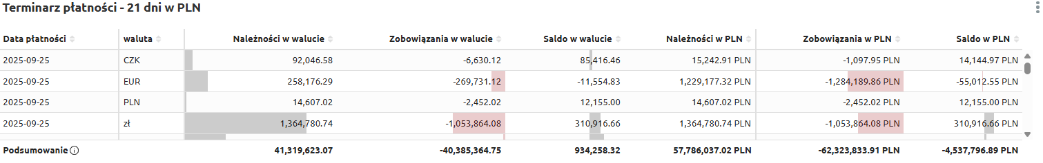 „Terminarz płatności – 21 dni w PLN – tabela” – zestawienie prezentuje prognozę należności i zobowiązania na kolejne 21 dni, w podziale na waluty.