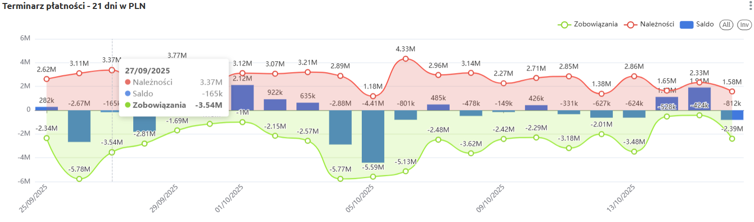 Dzięki temu wykresowi użytkownik może szybko ocenić, w których dniach występują największe obciążenia zobowiązaniami, a w których spodziewane są wpływy, co pozwala na lepsze planowanie płynności finansowej.