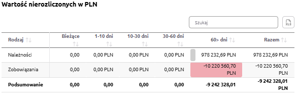 „Wartość nierozliczonych w PLN – tabela” – zestawienie prezentuje zaległe należności i zobowiązania w podziale na okresy przeterminowania. Dla każdej pozycji podawane są wartości w kategoriach: