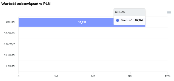 „Wartość zobowiązań w PLN” – wykres prezentuje zobowiązania firmy w podziale na okresy przeterminowania. Pozwala sprawdzić, jaka część zobowiązań jest bieżąca, a jaka wymaga już natychmiastowej reakcji.
