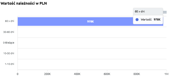 „Wartość należności w PLN” – wykres prezentuje należności firmy w podziale na okresy przeterminowania. Umożliwia sprawdzenie, jaka część należności jest bieżąca, a jaka jest już po terminie płatności.