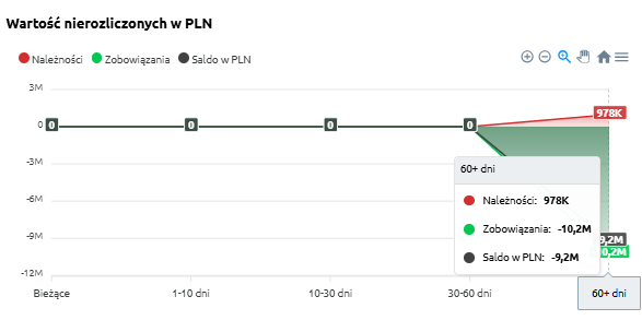 Saldo w PLN (czarny) – różnica pomiędzy należnościami a zobowiązaniami w danym okresie przeterminowania.