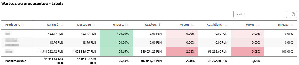 „Tabela wartości wg producentów” – zestawienie prezentuje wartości zapasów w podziale na poszczególnych producentów. Dla każdego producenta prezentowane są: