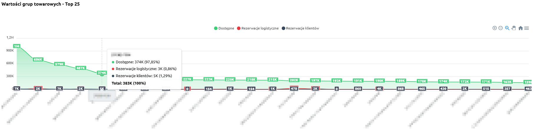 Dzięki temu wykres pozwala szybko ocenić, które grupy towarowe generują największą wartość magazynową oraz jaka część z nich jest dostępna, a jaka zarezerwowana.