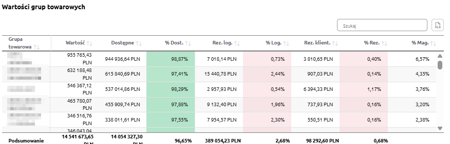 Rezerwacje logistyczne (czerwony) – zapasy zablokowane na potrzeby procesów logistycznych,
