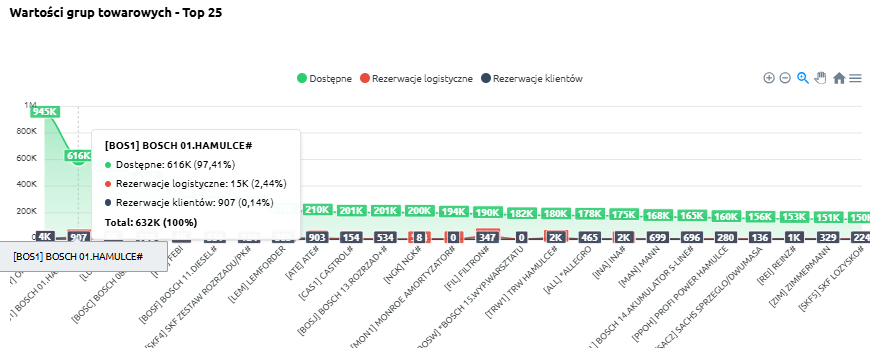 Pozwala to szybko wskazać, które grupy generują największą wartość magazynową i jaka część z nich jest już zarezerwowana.