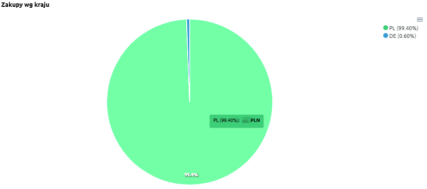 „Zakupy wg kraju” – wykres prezentuje udział zakupów w podziale na kraje, z których pochodzą towary i usługi. Dzięki temu można sprawdzić, na jakich rynkach firma ponosi największe koszty zakupowe.