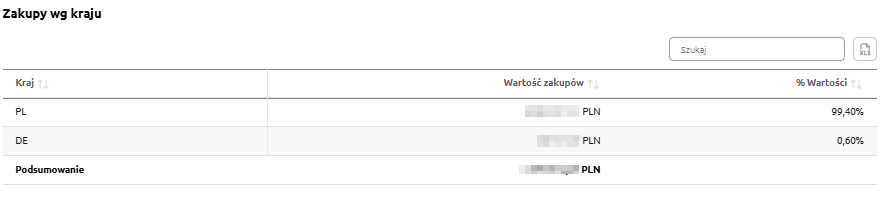 „Zakupy wg kraju – tabela” – zestawienie prezentuje wartość zakupów w podziale na kraje. Dzięki temu można sprawdzić, które rynki mają największy udział w strukturze wydatków zakupowych firmy.