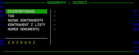 Widok przeglądu umożliwia precyzyjne filtrowanie listy dokumentów. W celu zaznaczenia dokumentów należy przejść do Przeglądu dokumentów KSEF, użyć skrótu [CTRL + LEFT], wybrać opcję ZAZNACZ WEDŁUG i wprowadzić odpowiednie dane.