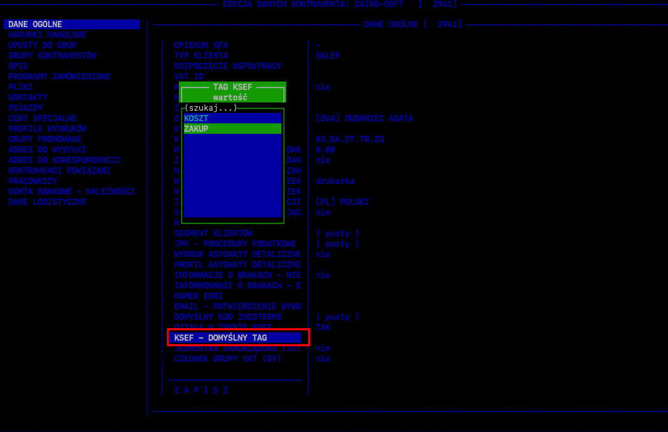 KSEF - DOMYŚLNY TAG– wybierz odpowiedni znacznik z listy.