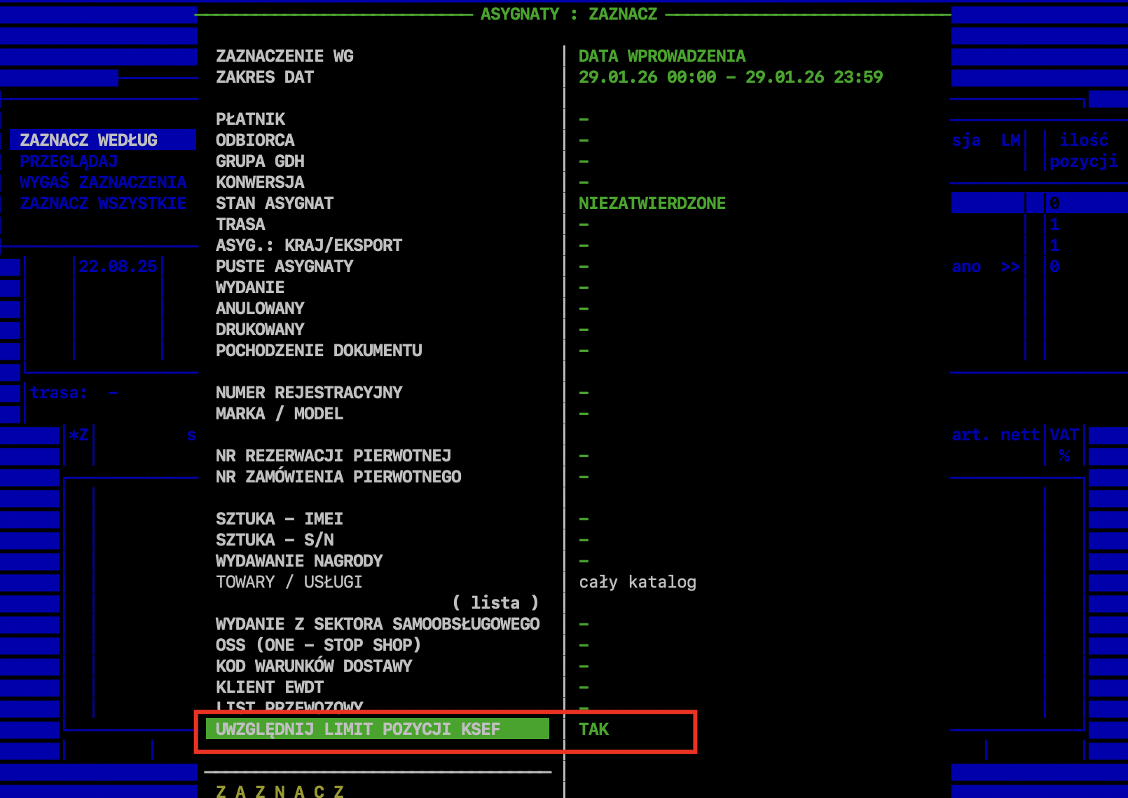 Opis: Określa próg liczby pozycji, powyżej którego system wyświetli ostrzeżenie. Wartość ta może być zmieniana przez serwis (np. na 5000).